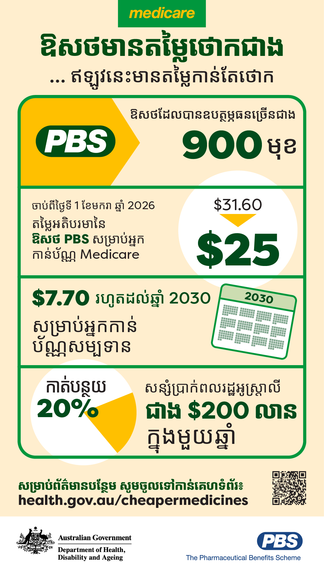ក្រាហ្វិកព័ត៌មាននេះរំលេចពីការផ្លាស់ប្តូរចំពោះតម្លៃឱសថ PBS រួមទាំងការទូទាត់ប្រាក់រួមគ្នាដែលកាត់បន្ថយនៅត្រឹម $25 សម្រាប់អ្នកកាន់ប័ណ្ណ Medicare និងការបង្កកការទូទាត់ប្រាក់រួមគ្នាសម្រាប់អ្នកកាន់ប័ណ្ណសម្បទានរហូតដល់ឆ្នាំ 2030 ដោយអនុវត្តចំពោះឱសថឧបត្ថម្ភធនច្រើនជាង 900 មុខ។