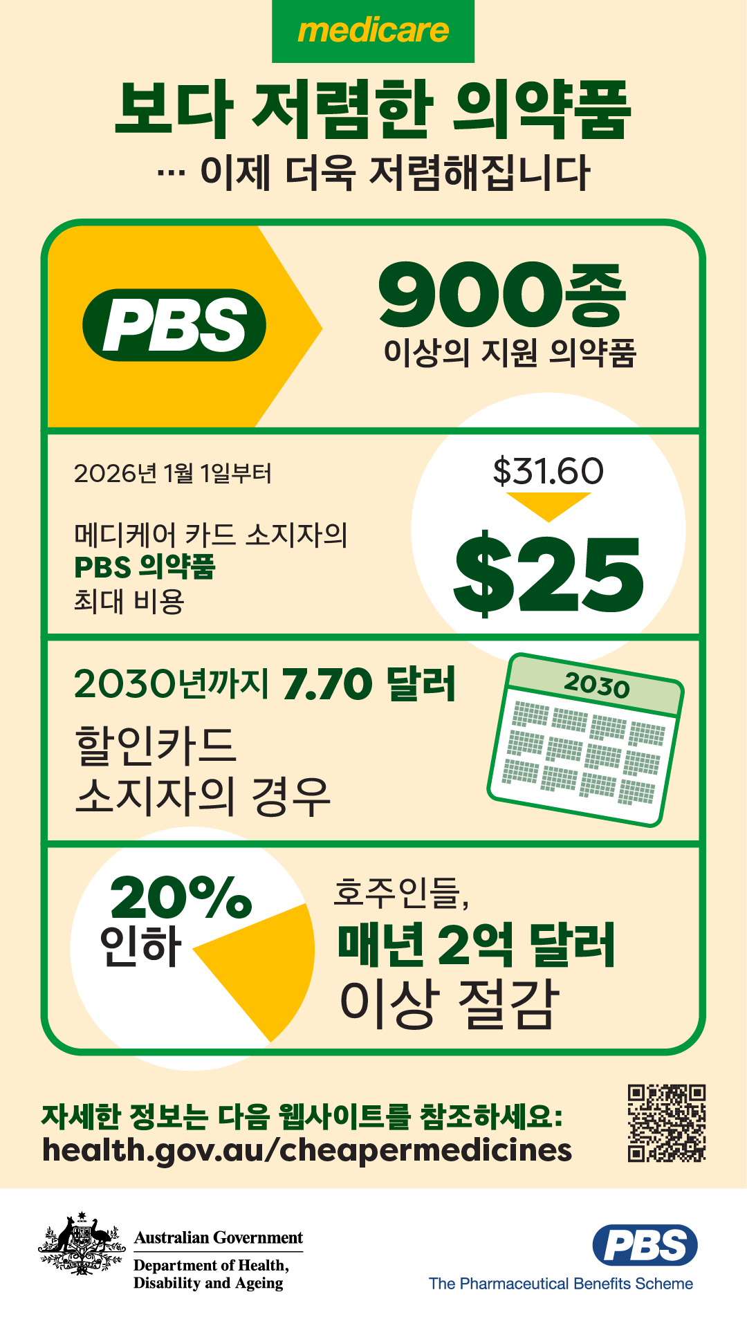 본 인포그래픽은 메디케어 카드 소지자의 공동부담금이 25 달러로 인하된 사항과 2030년까지 할인카드 소지자의 공동부담금 동결 등, 900여 종 이상의 지원 의약품에 적용되는 PBS 의약품 비용 변경 사항을 중점적으로 소개합니다.