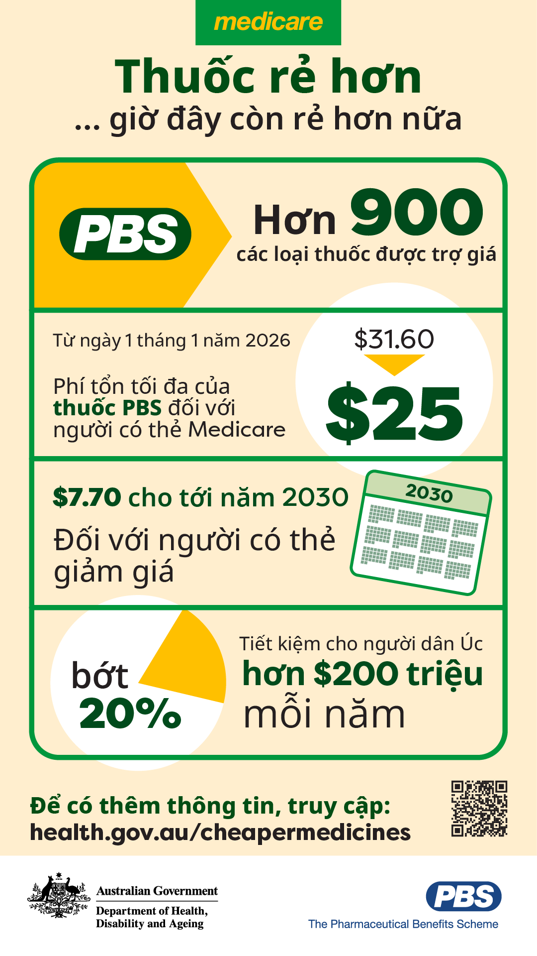 Đồ họa nêu các thay đổi về phí tổn thuốc PBS, gồm khoản đồng thanh toán giảm còn $25 cho người có thẻ Medicare và khoản đồng thanh toán giữ nguyên cho người có thẻ giảm giá tới năm 2030, áp dụng cho hơn 900 thuốc được trợ giá.