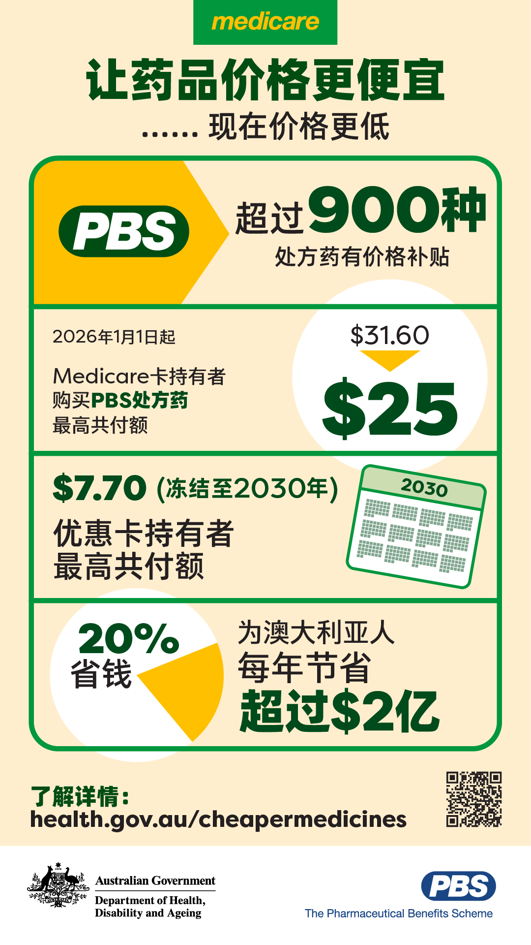 介绍PBS处方药价格新政策,包括Medicare卡持有者的共付额现已降至$25,优惠卡持有者的共付额冻结至2030年。这些变化适用于900多种政府给予补贴的药品。