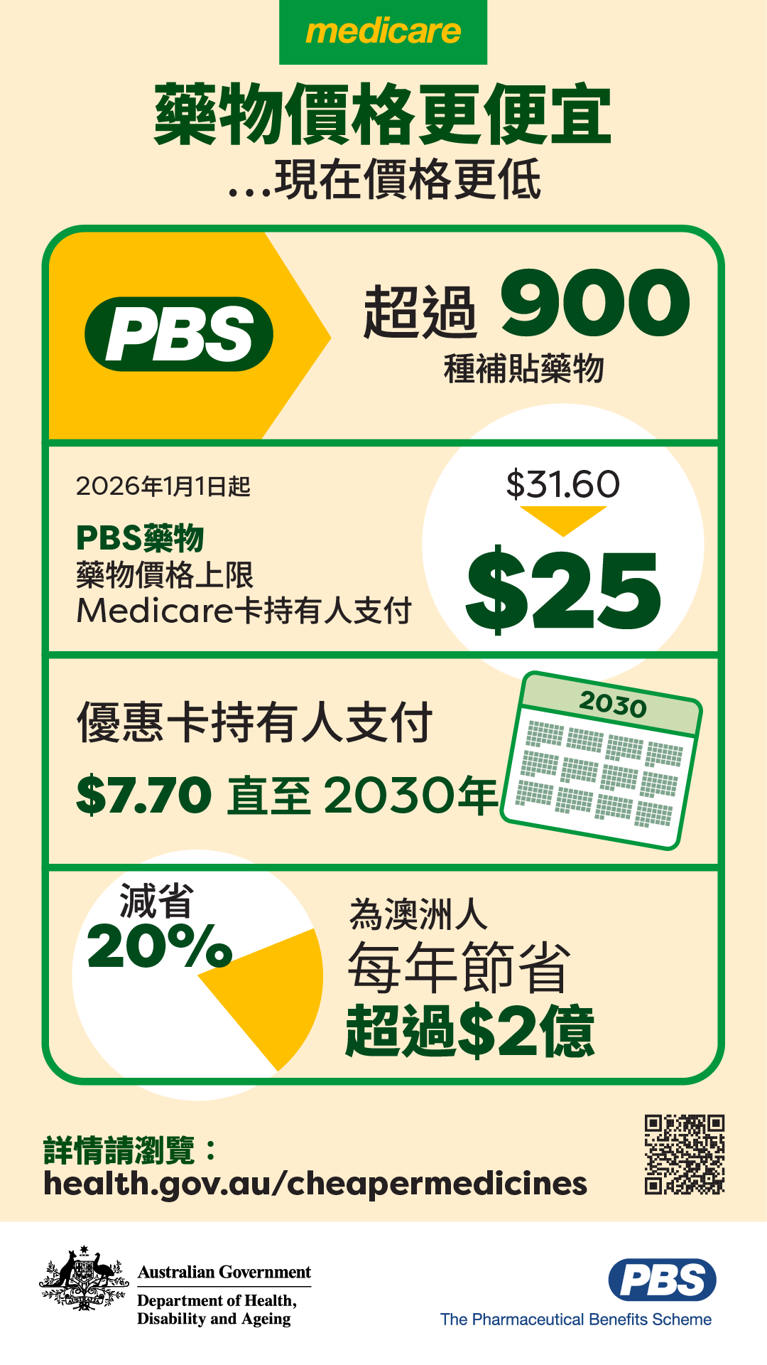 本資訊圖表重點介紹PBS 藥物費用的改變,包括將 Medicare 卡持有人的共付費用下調至$25,並將優惠卡持有人的共付費用凍結至 2030 年,適用於 900 多種補貼藥物。