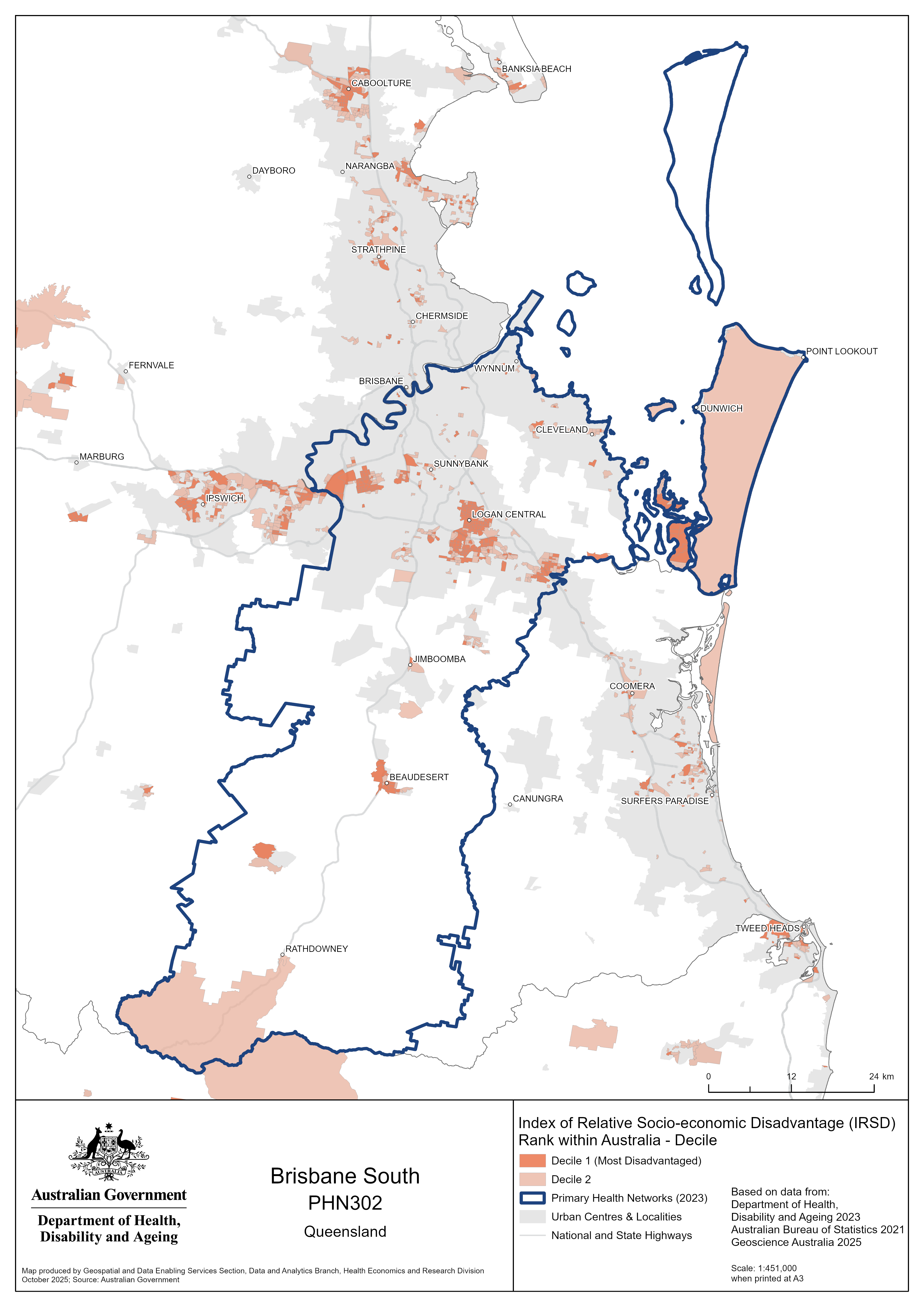 Brisbane South (Qld) PHN map – socioeconomic disadvantage