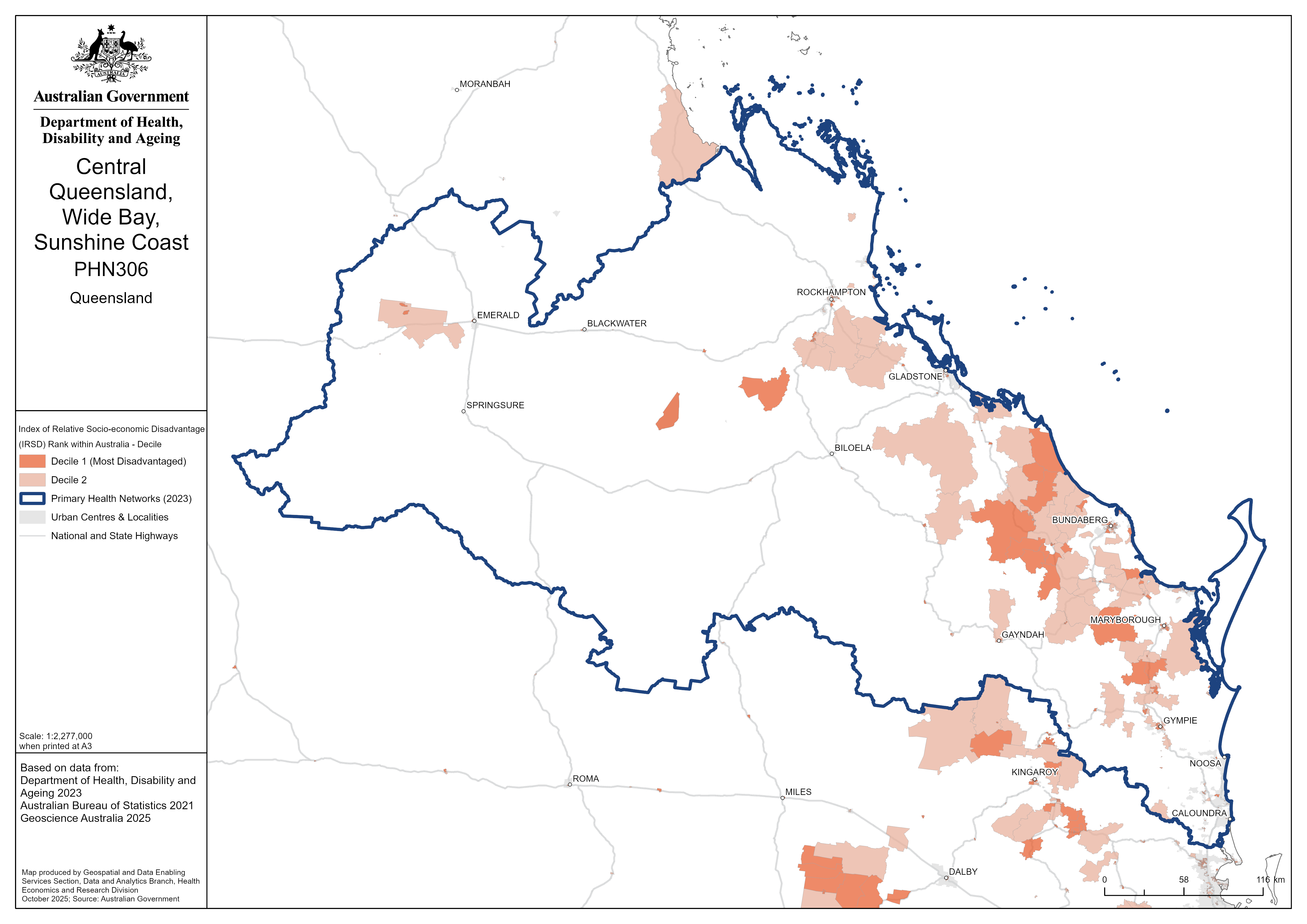 Central Queensland, Wide Bay, Sunshine Coast PHN map – socioeconomic disadvantage