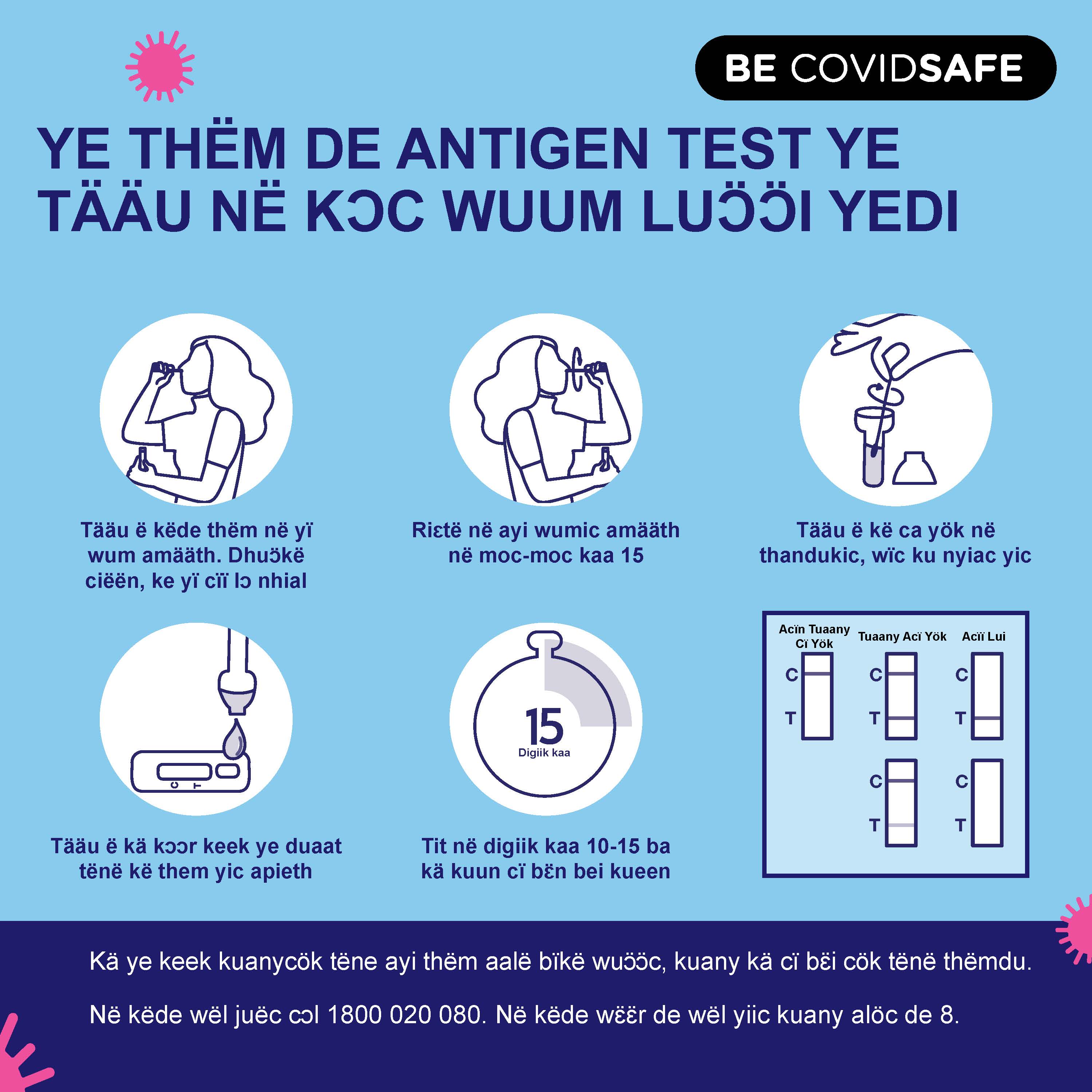 Coronavirus (COVID-19) – Social – YE THËM DE ANTIGEN TEST YE TÄÄU NË KƆC WUUM LUƆ̈Ɔ̈I YEDI (Nasal swab RAT)