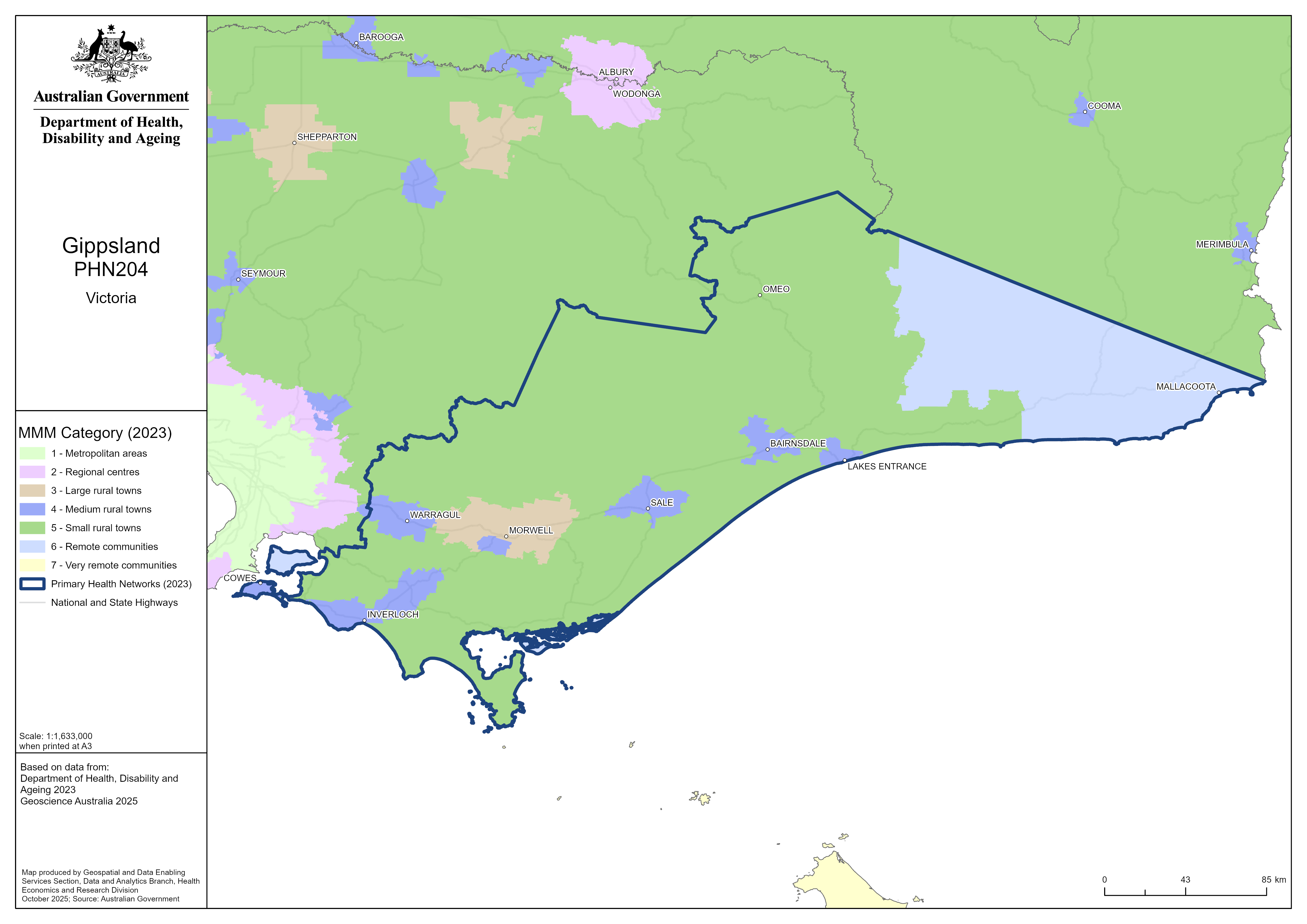 Gippsland (Vic) Primary Health Network (PHN) map – Modified Monash Model (MMM) remoteness area