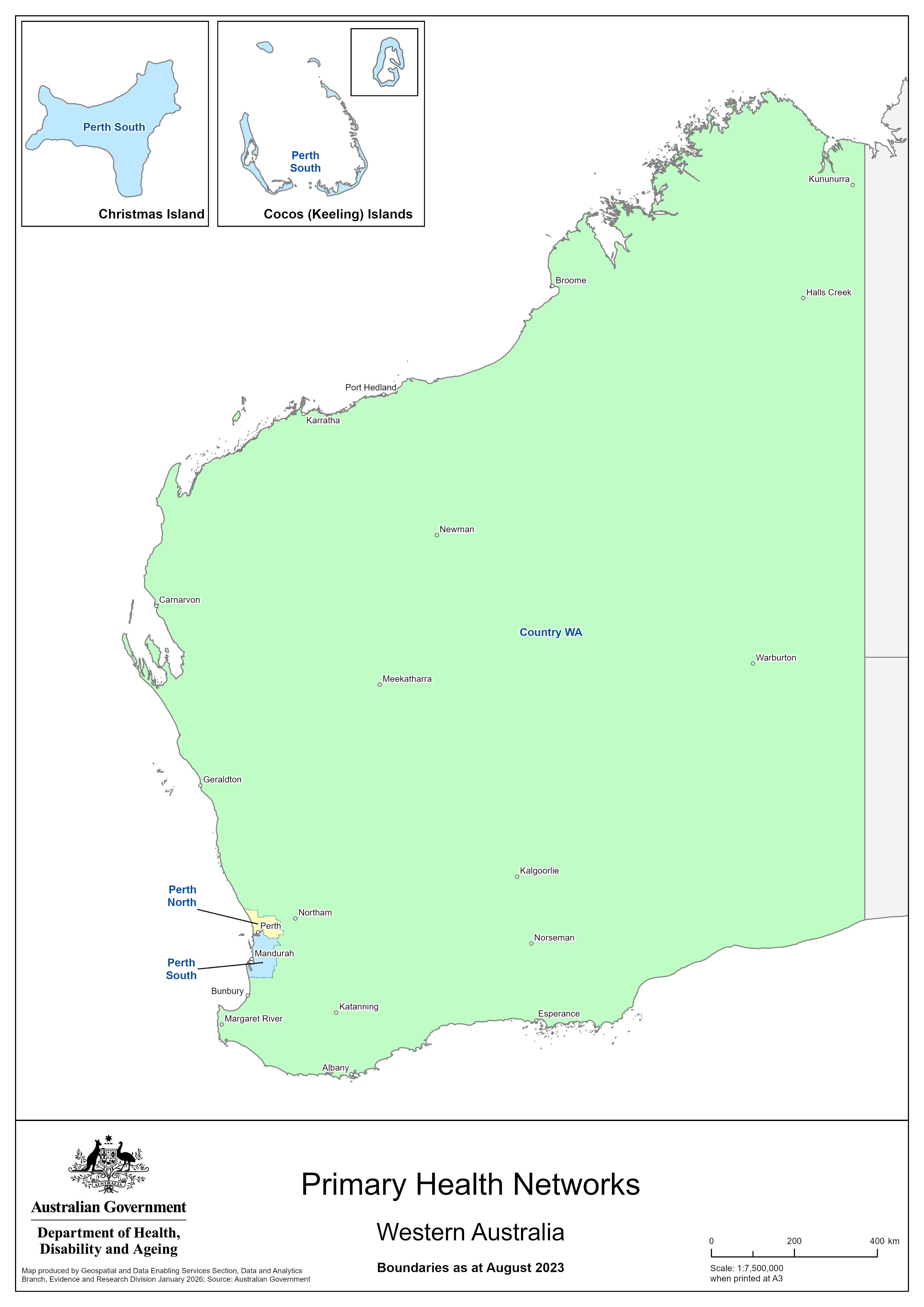 These maps show the boundaries for Western Australia Primary Health Networks (PHNs) across the whole state and in more detail in metropolitan areas only.